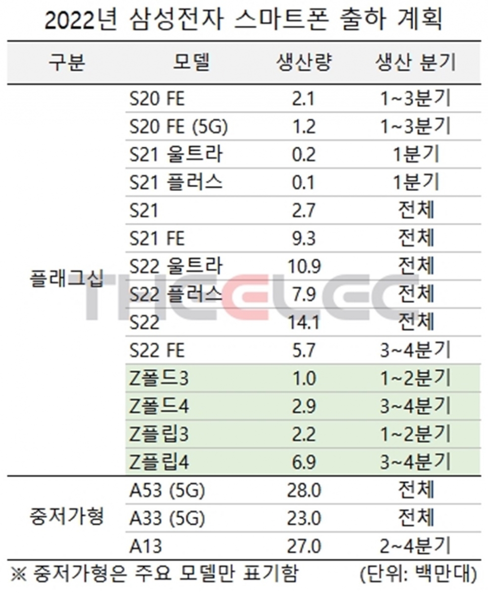 Totuși, chiar dacă interesul pentru smartphone-urile pliabile a crescut în ultimii ani, topul vânzărilor este dominat de seria Galaxy S, respectiv Galaxy A. Potrivit documentului, Samsung preconizează vânzări de 14 milioane de unități pentru Galaxy S22, 8 milioane pentru Galaxy S22+ și 11 milioane pentru Galaxy S22 Ultra. În cazul modelului Ultra e de înțeles faptul că va crește capacitatea de producție, acest model urmând să primească S-Pen și fiind un model dedicat inclusiv fanilor Note.