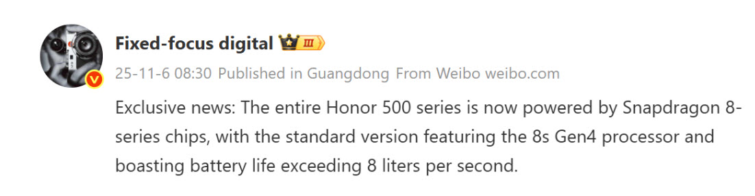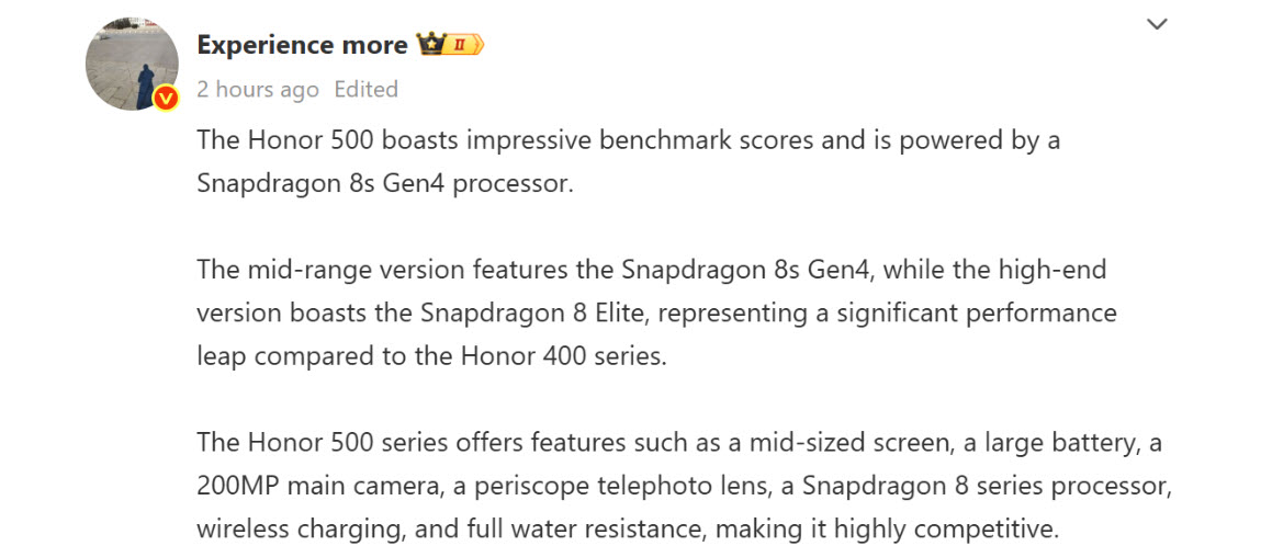 Aşadar, Snapdragon 8s Gen 4 apare pe HONOR 500 şi Snapdragon 8 Elite pe HONOR 500 Pro. Informaţiile vin de la zvonacul de încredere Fixed Focus Digital şi de la un inginer HONOR. MEY-AN00 este numele de cod asociat lui HONOR 500. Bateriile vor avea 8000 mAh pe ambele telefoane. Un alt zvonac menţionează şi că ambele modele vor avea suport pentru încărcare wireless, dar şi certificare full pentru rezistenţa la apă, adică IP68 şi IP69.