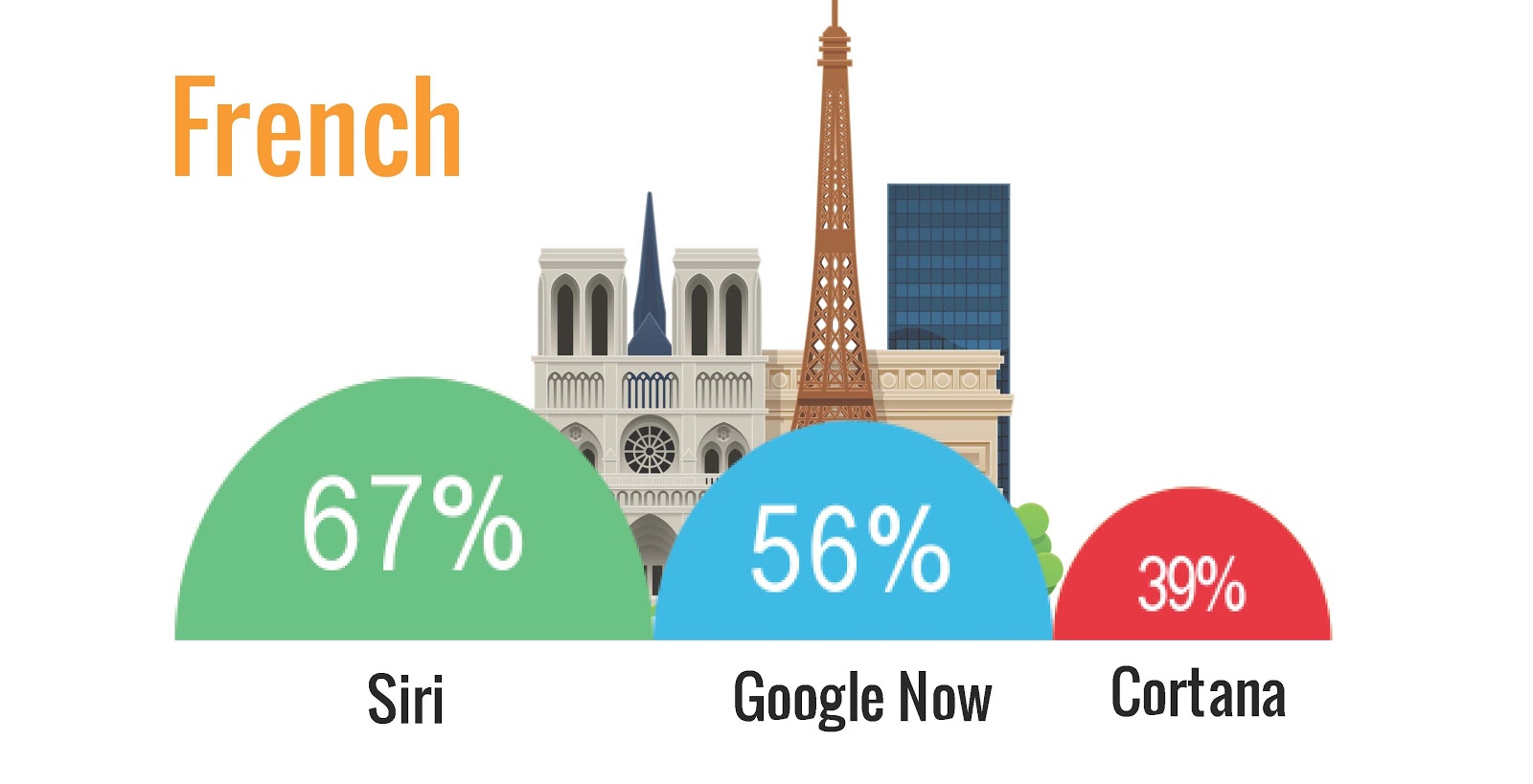 De asemenea, punctaje similare s-au înregistrat și în cazul întrebărilor din franceză și germană, surpriza fiind dată de către dialectul chinez. în cadrul acestui test, Siri a obținut din nou prima poziție cu un scor de 13.5, în timp ce Cortana primit o notă de 5, iar Google Now un punctaj de doar 1.5 din 18.