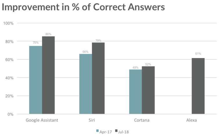 Va putea oare Siri să ţină pasul totuşi? Făcând şi o comparaţie cu versiunile mai vechi, Google Assistant s-a îmbunătăţit cu 11% în ultimele 15 luni, Siri cu 13%, iar Cortana doar cu 3%. Pentru Alexa nu sunt date de acest tip în acest studiu. Găsiţi toată analiza aici.