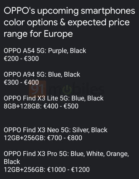 Sumele pornesc de la 400 euro pentru modelul Lite și ar putea ajunge până la 1200 euro în cazul variantei Pro. Toate telefoanele menționate aici dispun de conectivitate 5G iar modelul de top este Find X3 Pro de la care așteptăm un procesor Snapdragon 888, 12 GB RAM și un ecran OLED de 6.7 inch cu rezoluție WQHD+ și rată de refresh de 120Hz. Acesta are rezervat și un setup foto special care include doi senzori Sony IMX 766 la pachet.
