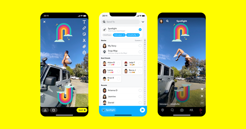 Spotlight a debutat că o secţiune a aplicaţiei Snapchat, care se va axa pe video-uri create de către utilizatori. De această dată ele sunt scoase în faţa mai mult şi vor exista şi creatori de conţinut plătiţi, cu fonduri de milioane de dolari deja alocate. Snapchat promite că va plăti 1 milion de dolari pe zi până la finalul lui 2020 celor care partajează cele mai populare clipuri. Conceptul acestei noi funcţii aduce cu Instagram Reels şi include clipuri verticale care pornesc automat (auto play) şi posibilitatea de a face swipe în sus sau jos pentru a face trecerea între clipuri, că la TikTok.