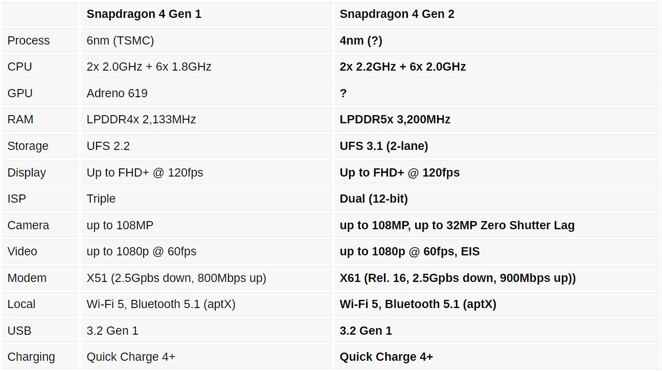 Vorbim în acest caz despre un CPU octa-core care include două nuclee tactate la 2.2GHz care se ocupă cu performanța și 6 nuclee tactate la 2GHz pentru eficiență energetică. Conform companiei, vorbim despre un boost de performanță de aproximativ 10% față de predecesor (Snapdragon 4 Gen 1). Compania nu a dezvăluit informații cu privire la GPU, dar am aflat că acest cipset suportă display-uri cu rezoluție Full HD+ și refresh rate de până la 120Hz.