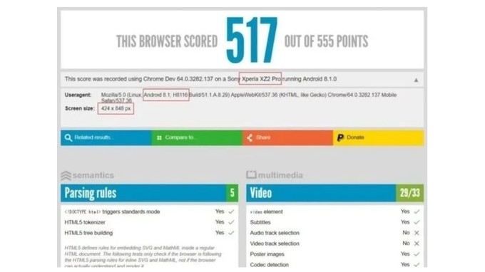După cum putem vedea pe seama capturii de ecran de mai sus, acest telefon rulează sistemul de operare Android 8.1.0 și este chiar specificat faptul că este vorba despre Xperia XZ2 Pro. Telefonul apare menționat cu un ecran ce oferă rezoluție de 424 x 848 pixeli, iar știind faptul că rezoluția din HMTL5Test este de 3 ori mai mică decât cea reală, atunci vom avea parte de un ecran cu rezoluție atipică de 1272 x 2544 pixeli.