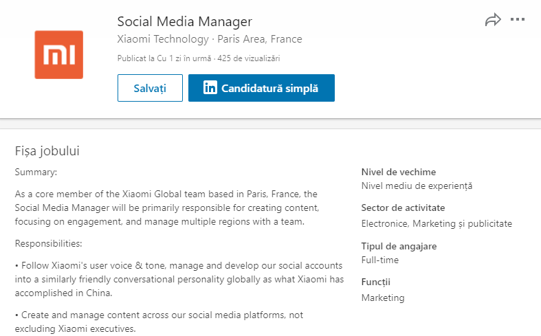 Este vizată o persoană cu cel puțin 5 ani de experiență în domeniul social media care să vorbească fluent atât engleza, cât și limba franceză. Mai sunt notate și responsabilitățile pe care managerul le va avea în cadrul companiei, una dintre acestea fiind aceea de a comunica cu echipele Xiaomi din diferite țări pentru a demara campanii și activități media în online.