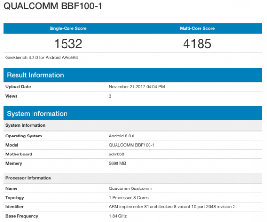 Terminalul a apărut în GeekBench, cu numele de cod "Qualcomm BBF100-1", care se aliniază cu numele de cod ale lui BlackBerry Motion şi BlackBerry KeyOne. Când vine vorba de dotări, terminalul vine cu un procesor Qualcomm Snapdragon 660 şi 6 GB RAM. Din păcate nu avem şi alte detalii despre device, deci va trebui să aşteptăm debutul oficial, care are şanse să se întâmple la CES 2018 în ianuarie.