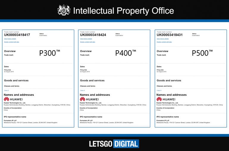 La prima vedere aceste denumiri par a ne da de înțeles că succesorul lui Huawei P30 nu se va numi Huawei P40, ci Huawei P300 aparent. Pe lângă această marcă comercială, compania chineză a înregistrat la EUIPO și denumirile Huawei P400, respectiv Huawei P500. Aceleași denumiri au fost înregistrate și în cadrul UK IPO după cum vedeți în captura de mai jos.