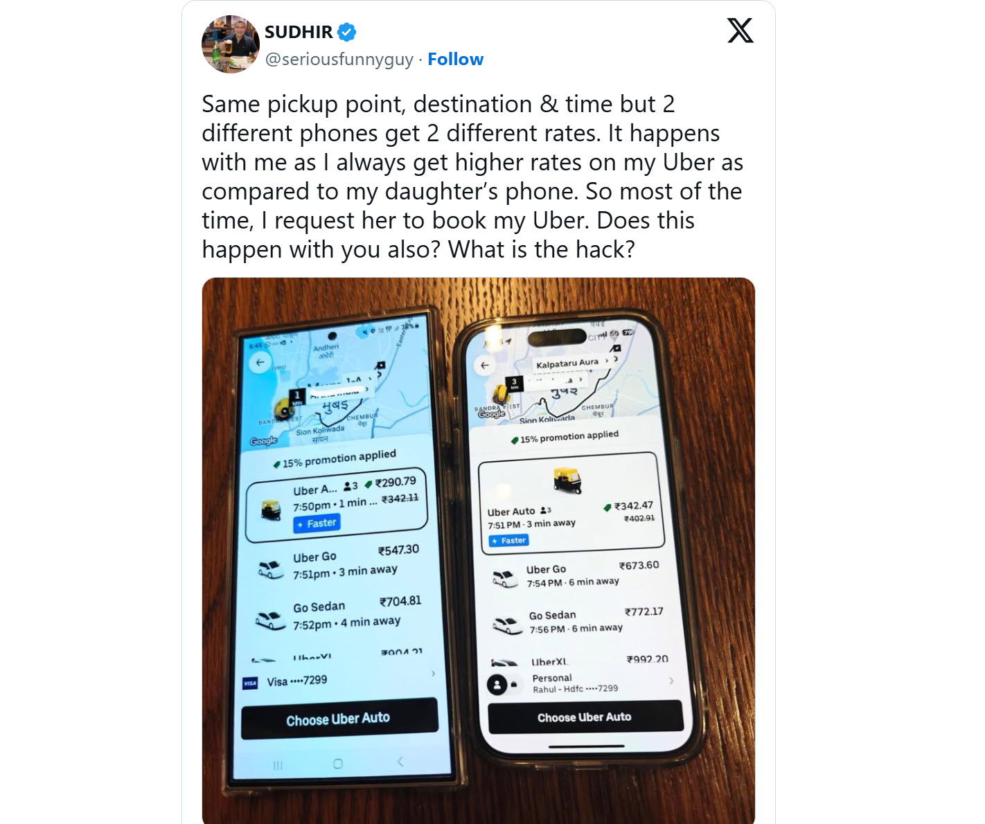 Totul a pornit de la o postare virală în social media, care afirmă că Uber taxează diferit cursele pe iPhone faţă de telefoanele Android. Cei de la Times of India au făcut o investigaţie şi au solicitat şi poziţia oficială a Uber. Totul a pornit de la o postare pe Linkedin a lui Nirali Parekh, care a rezervat o cursă de Uber pe Android şi pe iPhone, cu acelaşi punct de plecare şi sosire.