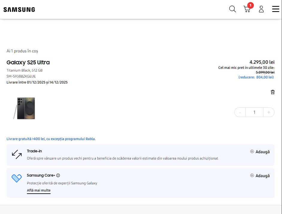 [UPDATE 10-11-2025] - Deși în weekend s-au epuizat rapid, Samsung pare că a suplimentat stocurile de Galaxy S25 Ultra în variantă ce implică 12 GB RAM și 512 GB de stocare. Prețul ar fi de 4.759 lei, doar că există 2 coduri speciale ce pot fi cumulate pentru 10% extra-discount. Am înțeles că unele bănci oferă chiar cashback pentru cumpărături pe site-ul Samsung, iar dacă profiți de oferta de buy-back poți obține un preț chiar bun pentru acest flagship.
