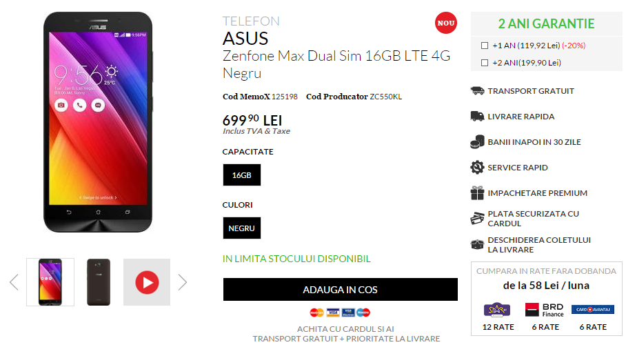 Avem la dispoziție 16 GB spațiu intern de stocare + slot microSD, o cameră foto principală de 13 megapixeli cu deschidere f/2.0, telemetru laser și bliț dual-tone. Regăsim și un senzor frontal de 5 megapixeli, conectivitate A-GPS, Glonass, OTG și suport 4G LTE. Puteți comanda produsul Asus ZenFone Max la un super preț de aici!