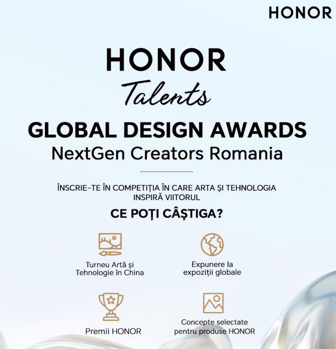 La noi se numeşte HONOR Talents: NextGen Creators România, iar prin intermediul său creativii români pot avea meritele recunoscute şi creaţiile premiate. Competiţia a deschisă tuturor, de la studenți la profesionişti ai design-ului grafic sau de produs. E deschis şi celor din industriile creative şi celor pasionaţi de arta digitală, care simt că au o voce în domeniu.