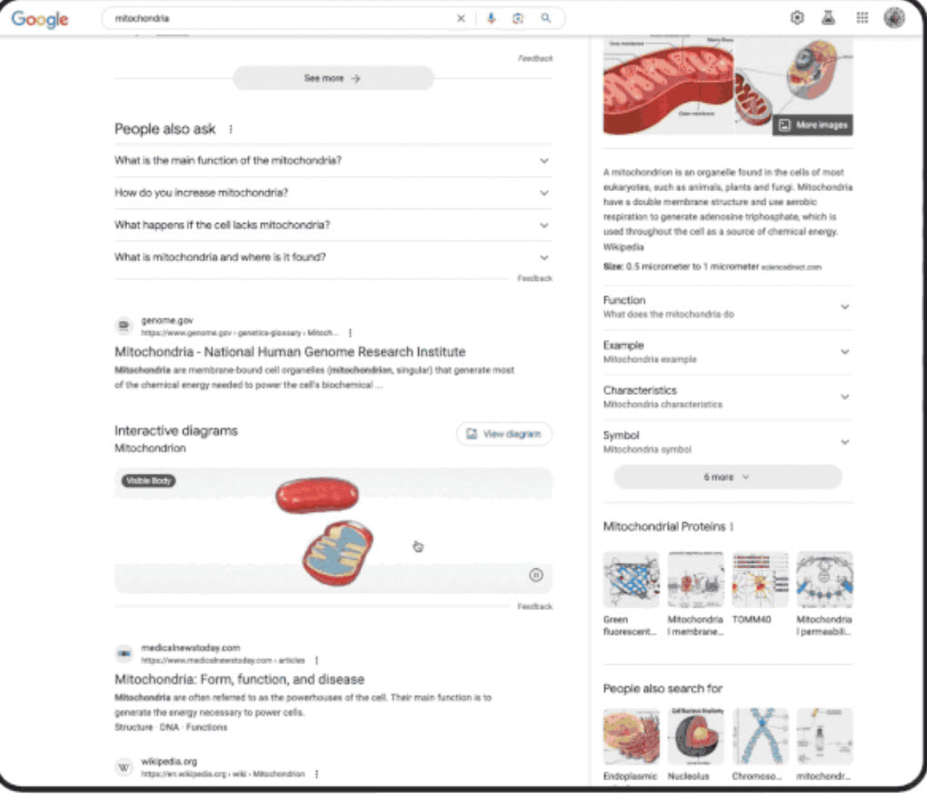 Avem şi învăţare vizuală din domeniul biologiei, cu modele 3D şi diagrame. Se aplică şi la chimie, fizică, astronomie. Şi nu e totul doar pentru şcolari, e şi pentru cei care vor să îşi satisfacă curiozitatea via Google.
