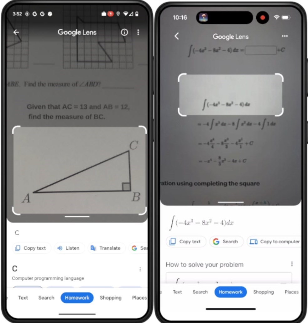 Google a actualizat serviciile Search şi Lens pentru a îi ajuta pe elevi să rezolve probleme complexe. Oferă suport pentru matematică, fizică, geometrie. Atunci când cauţi în bara respectivă probleme de matematică şi ştiinţă, poţi primi asistență cu subiecte ca trigonometrie şi calcul. Trebuie doar să introduci ecuaţia în bara de căutare sau să foloseşti Lens pentru a face o fotografie.