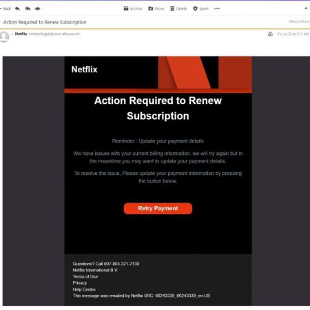 Directoratul Naţional de Securitate Cibernetică din România avertizează cu privire la o tentativă de phishing care ţinteşte utilizatorii Netflix. Ei pot primi mesaje false prin care li se solicită să îşi valideze încă o dată datele de pe card pentru a fi siguri că rămân abonaţi la serviciu. Mesajul este în limba engleză, provine de la un domeniu din Olanda şi include un link fraudulos. Accesarea să redirecţionează victima spre un site de phishing, prin care îi sunt furate datele bancare.