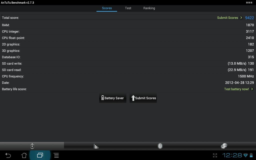 Am folosit 3 benchmark-uri pe acest terminal: faimosul Quadrant, AnTuTu și NeNaMark 2. Transformer Pad 300 are același procesor quad core Tegra 3 ca și Transformer Prime, dar cu frecvența de 1.2 GHz de această dată. Tableta dispune și de 1 GB RAM și vine cu Android 4.0.3 preinstalat, asta ca să știți cu ce aveți de-a face. în Quadrant tableta a scos 3723 puncte, deci peste Galaxy Tab și Galaxy Nexus, după cum arată chiar aplicația. în AnTutu am obținut 9422 de puncte și în NenaMark 2 am atins 46.0 fps.