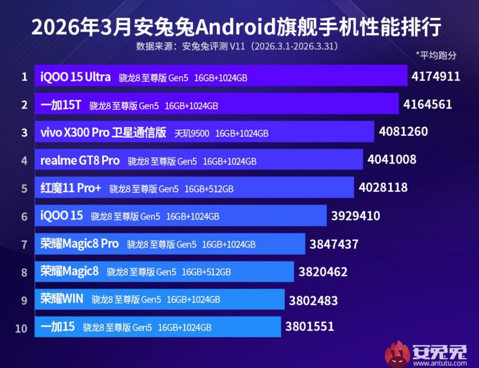 La final de lună februarie 2026, iQOO 15 Ultra domina clasamentul AnTuTu, cu 4.2 milioane de puncte. Acum, la final de martie, același model e pe locul întâi, cu 4.17 milioane de puncte, media testelor făcute în ultima lună. Pe locul 2 se află OnePlus 15T, ceea ce mă intrigă, deoarece luna trecută era Red Magic 11 Pro+. Ce e drept, OnePlus 15T nu se lansase încă la acea vreme.