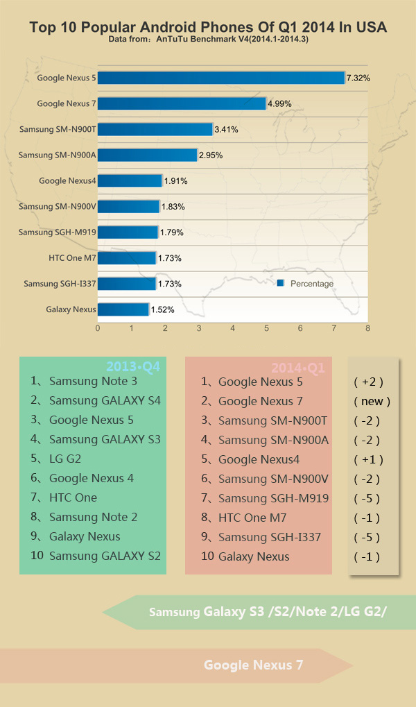 Acest top continuă cu nume ca Samsung Galaxy S3, LG G2, Google Nexus 4, HTC One, Samsung Galaxy Note 2 și Galaxy Nexus. Terminalul aflat pe ultima poziție este tot un device Samsung, și anume Galaxy S4, acesta fiind totodată și cel de-al 6-lea device Samsung din topul celor mai populare 10 smartphone-uri cu Android din US.
