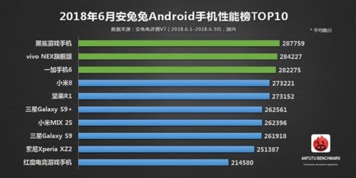 Aflați că acestea sunt scorurile medii obținute pe seama datelor adunate de la cel puțin 1000 unități pentru fiecare smartphone în parte. Primul loc îi revine lui Xiaomi BlackShark care obține 287759 puncte, fiind urmat pe 2 de recentul Vivo NEX S cu 284227 puncte și pe 3 de OnePlus 6 cu 282275 puncte.