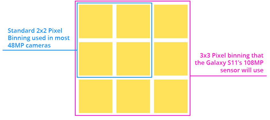 Secretul camerei principale de 108 MP este tehnologia Pixel Binning, combinarea a mai mulţi pixeli în unul singur. Rezultatul este o fotografie care ocupă mai puţin spaţiu, dar oferă extra detalii. Samsung face trecerea de la o grilă de combinare de pixeli de 2x2 la una de 3x3. Dacă un senzor de 48 MP scoate poze de 12 MP, unul de 64 MP scoate poze de 64 MP, aici vom avea unul de 108 MP care scoate cadre de 12 MP (12 x 9 = 108). Mărimea virtuală de pixel ajunge de la 0.8 microni la 2.4 microni astfel.