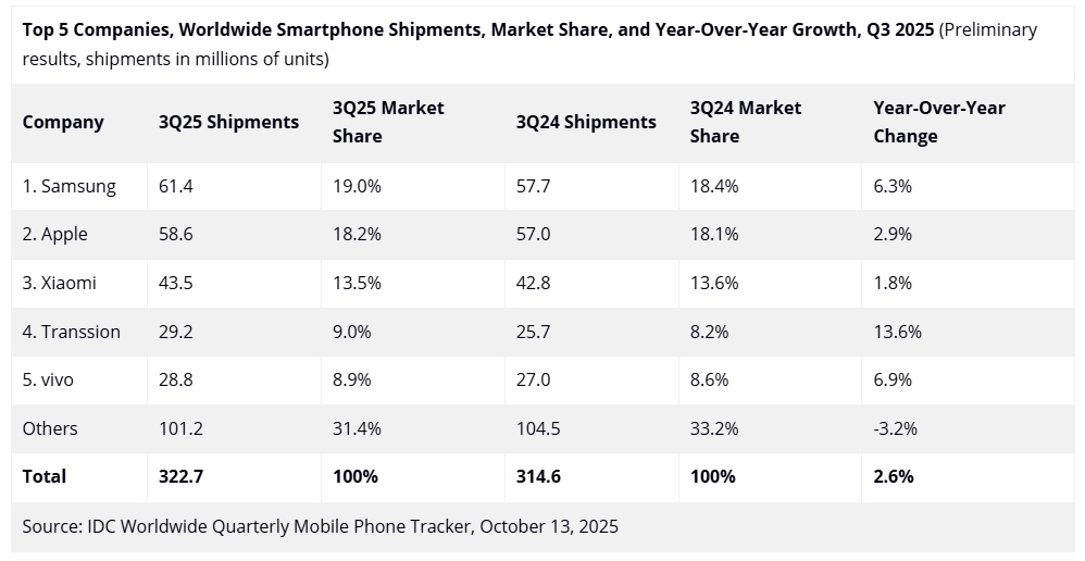 Din partea IDC sosesc astăzi date despre cum a arătat piața smartphone în trimestrul 3 al acestui an, fiind înregistrată o creștere de 2.6% comparativ cu aceeași perioadă a anului trecut. S-au livrat în total 322.7 milioane de smartphone-uri în T3 2025, comparativ cu 314.6 milioane în T3 2024, iar în vârf de clasament avem în continuare bătălia Apple-Samsung.