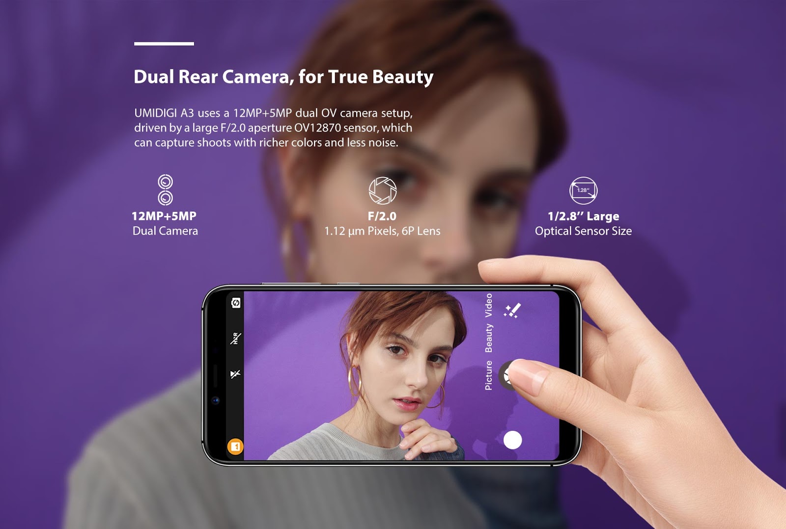 În spate găsim o cameră duală, cu senzori de 12 MP + 5 MP, deschidere F/2.0, iar în faţă se află o cameră de 8 MP. Mai primim şi Bluetooth 4.0, GPS, jack audio, suport OTG şi o baterie de 3300 mAh, care sună excelent la aşa o diagonală. Terminalul cântăreşte 186 de grame şi mai aduce şi radio FM. Vine pe Space Gray şi Auriu, conform producătorului şi de la distanţă e uşor de confundat cu iPhone XS.