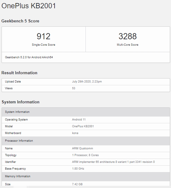 Nici bine nu s-a lansat OnePlus Nord și iată că deja vorbim despre următorul smartphone al companiei chineze, unul flagship de această dată. Descoperim astăzi o listare în baza de date GeekBench a unui telefon nou menționat aici sub numele de cod "OnePlus KB2001" și despre care internetul a început deja să vorbească, sugerând că ar putea fi vorba despre nimeni altul decât OnePlus 8T.