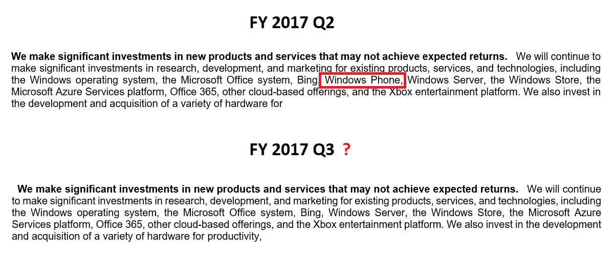 Astfel de documente trebuie să aibă o acurateţe maximă şi nu există speculaţii sau jumătăţi de măsură. Practic Microsoft detaliază riscurile şi beneficiile investiţiilor sale, iar lista de produse nu include şi Windows Phone. De remarcat că nu e vorba despre Windows 10 Mobile totuși.
