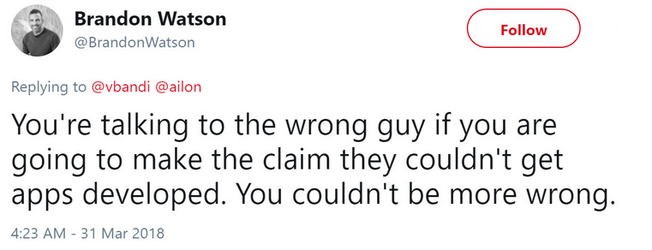 A reuşit să aducă Angry Birds pe Windows Phone şi a fost responsabil cu plasarea a 60.000 de aplicaţii în magazinul Windows Phone, deci chiar şi-a dat silinţa. Ca atare le-a răspuns dur celor care au vorbit de "golul de aplicaţii" între iOS/Android şi Windows Phone. Fostul oficial e convins că Windows Phone a ajuns pe "terminale de eşalon secund".