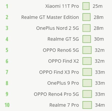 Astfel, primul loc este ocupat de Xiaomi 11T Pro, care beneficiază de alimentare la 120W și este urmat de modele realme, OPPO și OnePlus care ajung de la 0 la 100% în aproximativ 30 de minute. Acum, rămâne de văzut ce ne pregătește OPPO pe viitor. Nu aș fi surprins dacă ar debuta chiar modele din seria Reno8 cu asemenea capabilități de alimentare.
