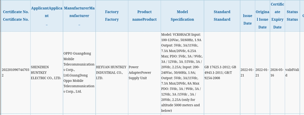 Alimentatorul și-a făcut apariția în baza de date 3C și este cunoscut după numărul de model VCK8HACH. Este dezvoltat de OPPO Guangdong Mobile Telecommunications Corp. și fabricat de Heyuan Huntkey Industrial Co. LTD, iar adaptorul livrează o putere de 160W (20V, 8A). Informații despre o asemenea tehnologie apăreau pe web încă de acum un an și a existat un zvon conform căruia noua serie Find X5, cât și OnePlus 10 ar urma să vină cu suport pentru alimentarea rapidă la 160W.