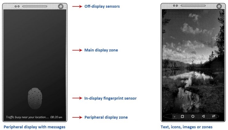 Brevetul ne prezintă zona în care se va afla integrat scanner-ul de amprente optic (Synaptics sau Goodix) în ecranul lui Huawei Mate 20 Pro, fiind vorba despre partea de jos centrală. Interesant este faptul că sub acest modul avem parte de ceva numit "zonă de ecran suplimentară" - unde vor fi afișate mesaje precum știri despre trafic, sau update-uri de pe rețelele de socializare.