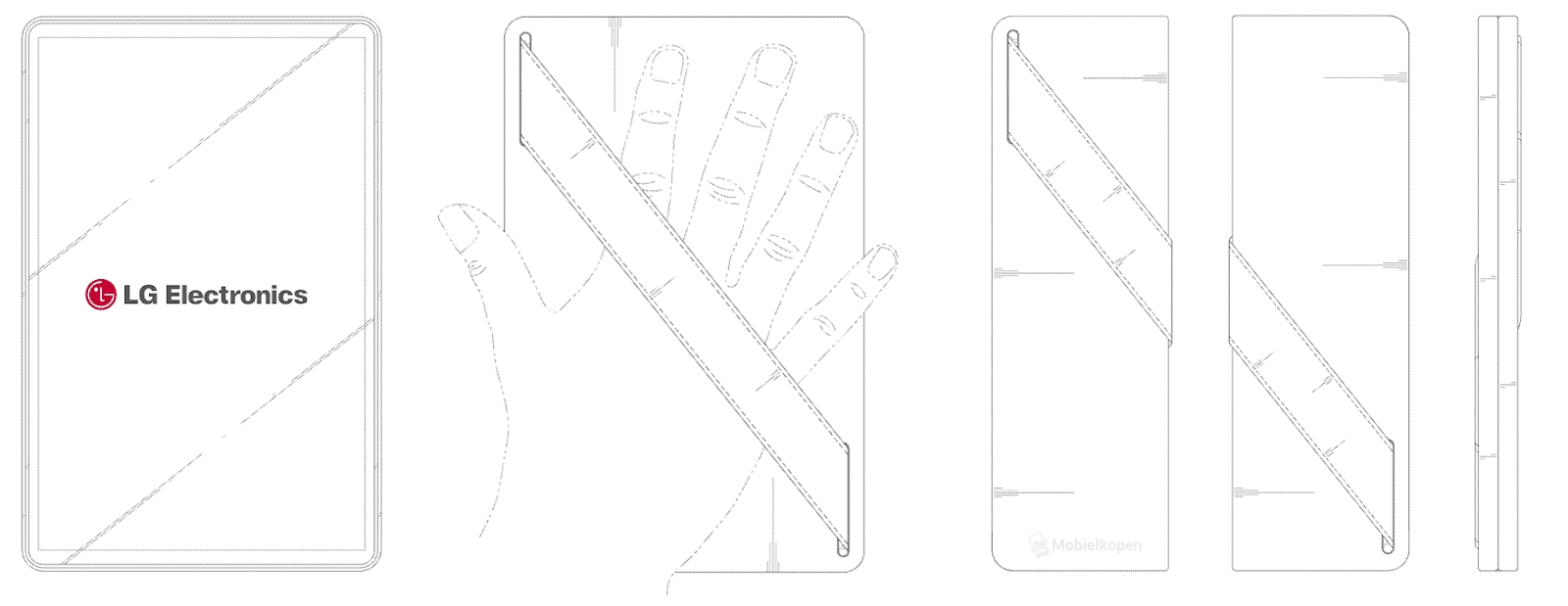 Schiţele fac referire la un terminal pliabil, care are în spate o curea de fixare pe mână. Un astfel de accesoriu poate avea multiple scopuri: fixarea telefonului pe palmă pentru captura selfie şi vlogging, e-reading pe perioade îndelungate sau pur şi simplu pentru a ţine un smartphone cu diagonală foarte mare mai comod. E interesant şi modul în care se pliază acest handset, pe verticală, cam ca un penar de la şcoală dacă vreţi. Rezultatul pare sa fie totuși foarte îngust și fără ecran extern.