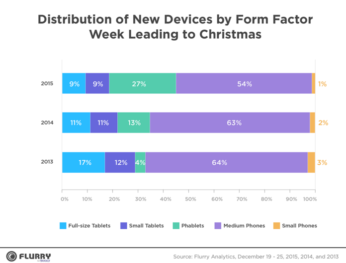 De asemenea, din graficul de mai sus remarcăm faptul că popularitatea phablet-urilor este într-o continuă creștere și în 2015. De la un procent de doar 4% terminale de tip phablet activate în 2013, iată că în acest an a fost activat un procent de 27% phablet-uri din totalul telefoanelor vândute în săptămâna 19-25 decembrie.