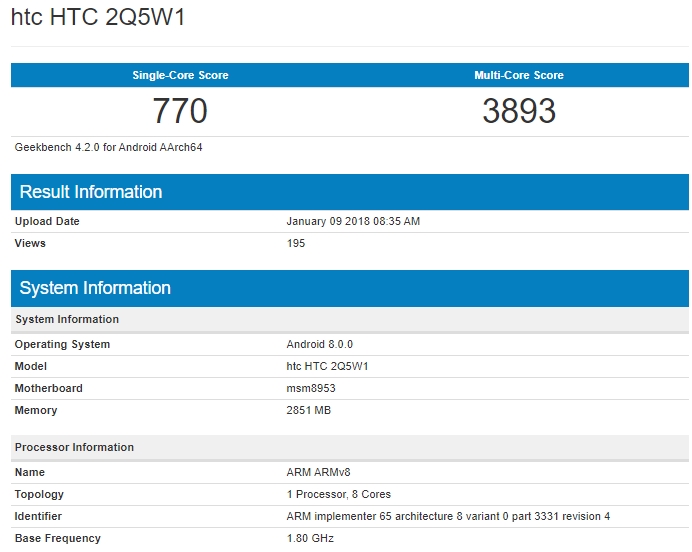 Vine și cu un procesor octa-core Qualcomm Snapdragon 625 la bord, iar din punct de vedere al performanțelor vedem că obține 770 puncte la testul single-core, respectiv 3893 puncte la testul multi-core. La capitolul dotări hardware pare a fi undeva între HTC U11 Life și HTC U11 Play, iar zvonurile apărute în online afirmă că ar fi vorba despre un succesor pentru modelul A9s.