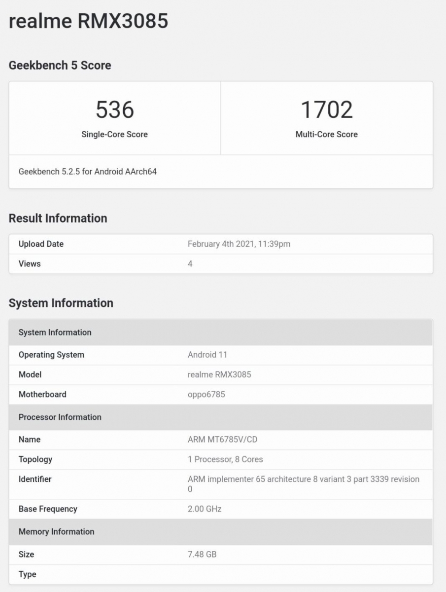 Terminalul a fost recunoscut după numărul de model “Realme RMX3085” și integrează un procesor MediaTek octa-core cu frecvență de bază de 2GHz. Procesorul menționat, MT6785V/CD, pare să fie Helio G95. Alături de acest cipset, mai regăsim 8GB de memorie RAM, iar telefonul rulează Android 11 direct din cutie. În testul single-core, RMX3085 reușește să obțină 536 de puncte și înregistrează un scor de 1702 puncte în cel multi-core.