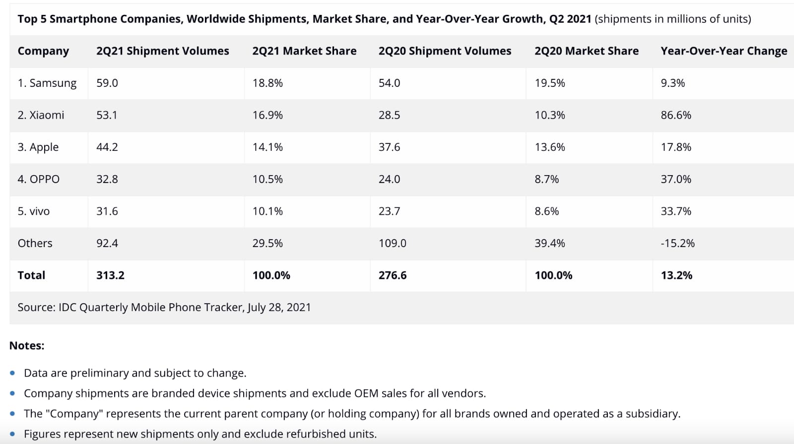 Alături de Canalys, acestea sunt cele mai importante 4 companii de cercetare de piață la nivel global și reconfirmă iată vestea că Xiaomi a depășit Apple în ceea ce privește livrările de smartphone-uri pe plan mondial în T2 2021 și urcarea pentru prima dată pe poziția 2. Cei de la IDC dezvăluie pe această cale și faptul că Xiaomi a atins un volum record în trimestrul 2 și o creștere anuală de 86.6%.