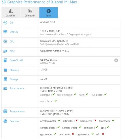 Primim o cameră foto principală de 16 megapixeli, un senzor frontal de 5 megapixeli și sistemul de operare Android 6.0.1 Marshmallow. Ținând cont de aceste dotări, ne putem aștepta la câteva variante diferite pentru Xiaomi Mi Max, aceasta afișată în GFXBench fiind mai degrabă modelul Lite și nu cel de top.