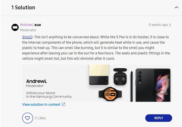 De ce apare acest miros? Ei bine, de vină ar fi căldura degajată de telefon în timpul utilizării. S-Pen-ul e fabricat din plastic, iar încălzindu-se, acest miros specific apare, întrucât stylus-ul stă mult timp în slotul dedicat, în corpul telefonului. Acest compartiment a fost proiectat aproape etanș de către companie pentru a nu permite pătrunderea lichidelor din exterior. Totodată, Samsung spune că e un miros specific ce apare în cazul plasticului reciclat folosit în construcția S-Pen-ului.