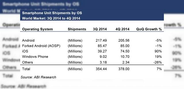 Astfel, prin intermediul unui raport realizat de către firma de research ABI Research, aflăm că numărul de terminale Android vândute în trimestrul 4 din 2014 a scăzut cu aproximativ 5 procente, mai precis de la 217 milioane unități livrate în trimestrul 3, în această ultimă perioadă din an s-au livrat 205 milioane de smartphone-uri Android.