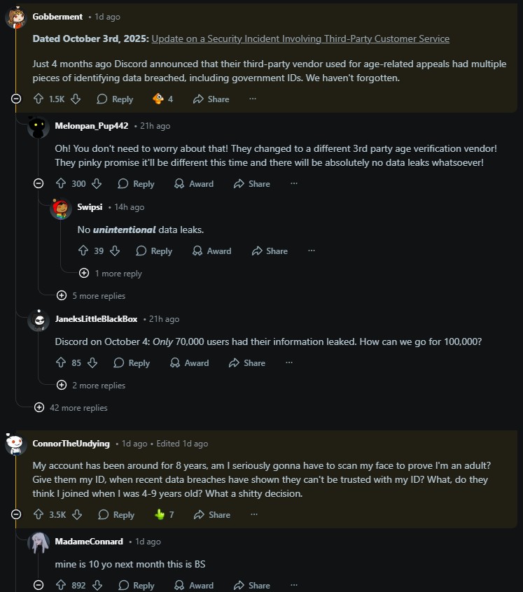 Pare însă că pentru Discord anonimatul a fost mereu un punct forte, iar schimbarea stârnește reacții din partea utilizatorilor. Nemulțumirea comunității se învârte aproape exclusiv în jurul confidențialității datelor. Mulți spun că nu vor să-și scaneze fața sau să trimită acte de identitate, indiferent de promisiunile companiei.