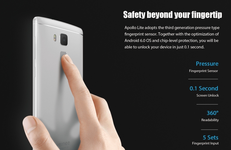 Ca orice flagship ce se respectă, și Vernee Apollo Lite beneficiază de un scanner de amprente, unul ce este plasat pe partea din spate în cazul de față. Senzorul promite deblocarea device-ului în doar 0.1 secundar, acesta fiind capabil să citească amprenta la 360 grade (indiferent de poziția în care degetul este plasat pe suprafața senzorului). Putem seta până la 5 amprente, și astfel beneficia de un nivel sporit de securitate.