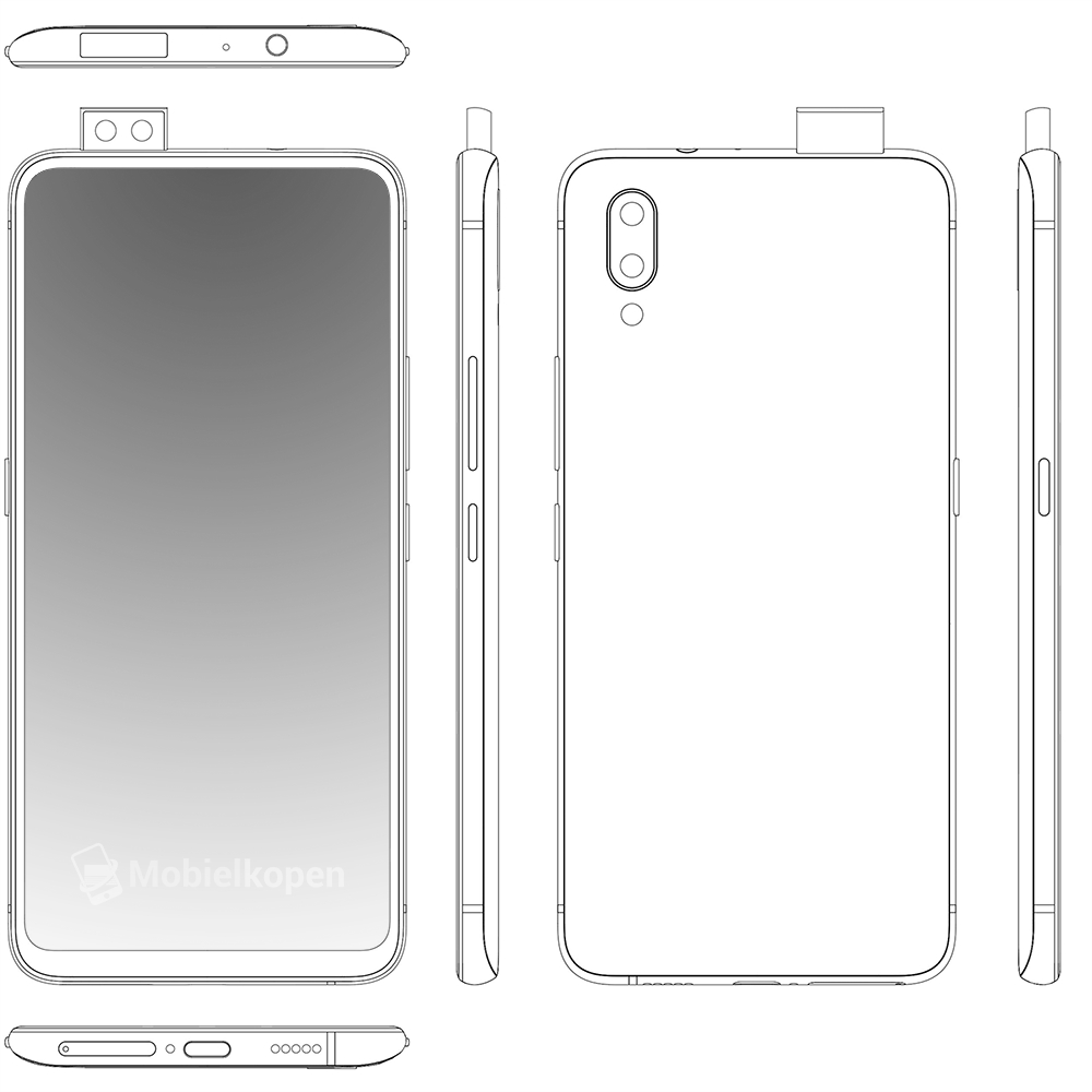 Brevetul de față a fost aprobat la data de 1 martie 2019 și ne prezintă un design de smartphone cu ecran edge-to-edge și fără vreun decupaj în zona superioară. Muchiile din jurul ecranului sunt destul de înguste cu excepția bărbiei de jos și observăm că pe lângă camera selfie duală din periscop, avem și o cameră foto duală în spate.