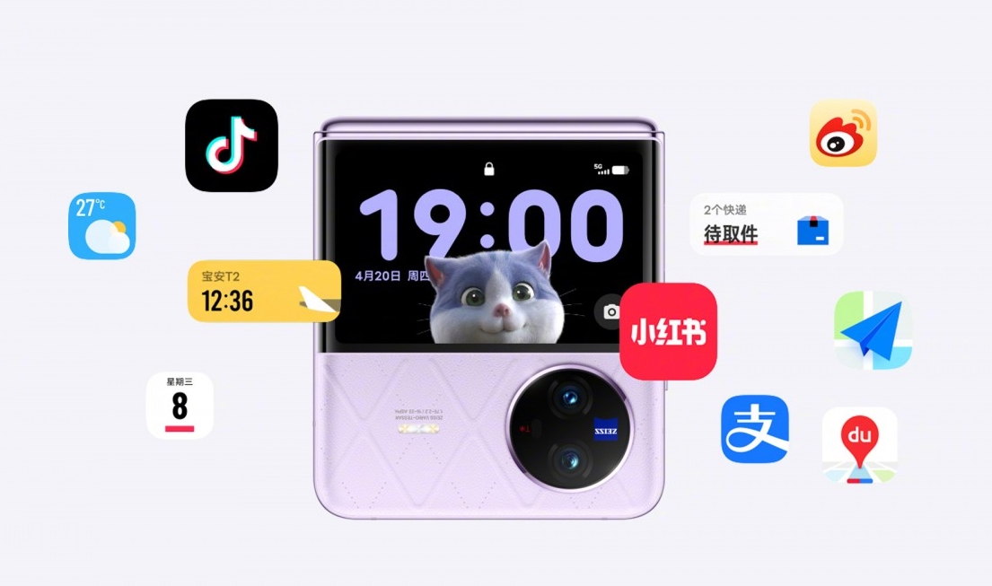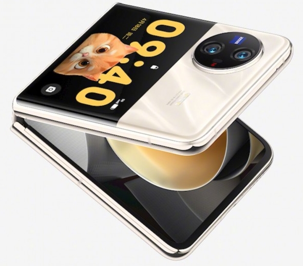 X Flip foloseşte un ecran de 6.74 inch, un AMOLED cu protecţie UTG şi cu pliu invizibil. Ecranul extern e generos ca diagonală, de 3 inch, e drept nu aşa mare precum cel de pe OPPO Find N2 Flip. Telefonul e disponibil pe mov, auriu şi negru şi vine cu funcţii pentru publicul feminin, precum o funcţie de oglindă de machiaj.