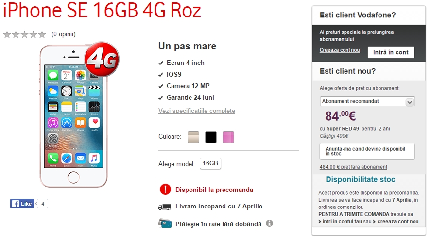 Așa cum ne-a anunțat de curând, Vodafone avea să dea startul precomenzilor pentru noul smartphone iPhone SE, lucru ce se întâmplă chiar astăzi. Operatorul listează în ofertă variantele de 16 și 64 GB memorie internă, telefoane ce sosesc în trei variante diferite de culoare: negru, auriu și roz.
