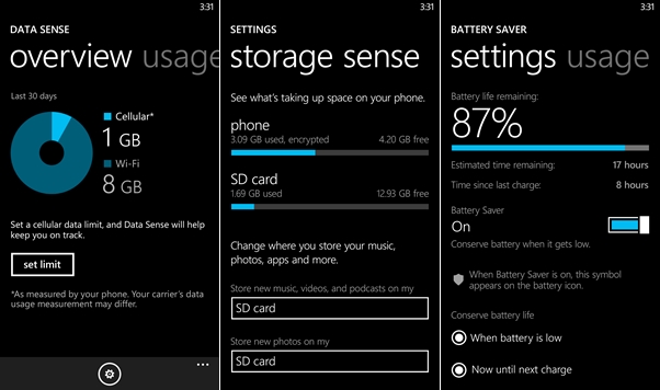 Noi funcții: Data Sense, WiFi Sense, Storage Sense, Battery Saver