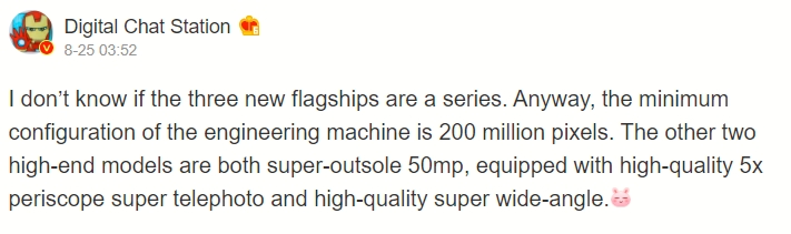 Zvonacul care a dezvăluit noile informații este Digital Chat Station. Se pare că Xiaomi ar avea 3 prototipuri în teste, unul dintre ele urmând să marcheze o premieră, fiind primul smartphone cu cameră de 200 MP de pe piață. Potrivit zvonurilor, acest senzor ar avea o dimensiune destul de mare, de 1 inch și ar suporta tehnologia pixel 16-in-1, unind 16 pixeli într-unul singur. Astfel, va realiza fotografii la 12 MP.