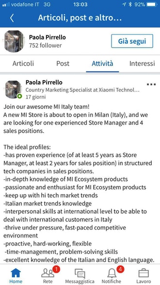 Xiaomi a urat pe contul său oficial de Facebook "Ciao Italia", cu ocazia deschiderii unui Mi Store în Milano. Între timp s-a deschis şi o pagină oficială de Facebook Xiaomi Italia, confirmând încă o dată apariţia unei filiale locale. Începutul acestei extinderi fusese dat de apariţia produselor Xiaomi în Amazon Italia toamna trecută. Acum sunt publicate şi oferte de muncă la Xiaomi Italia prin intermediul Linkedin aşa cum se vede mai sus.