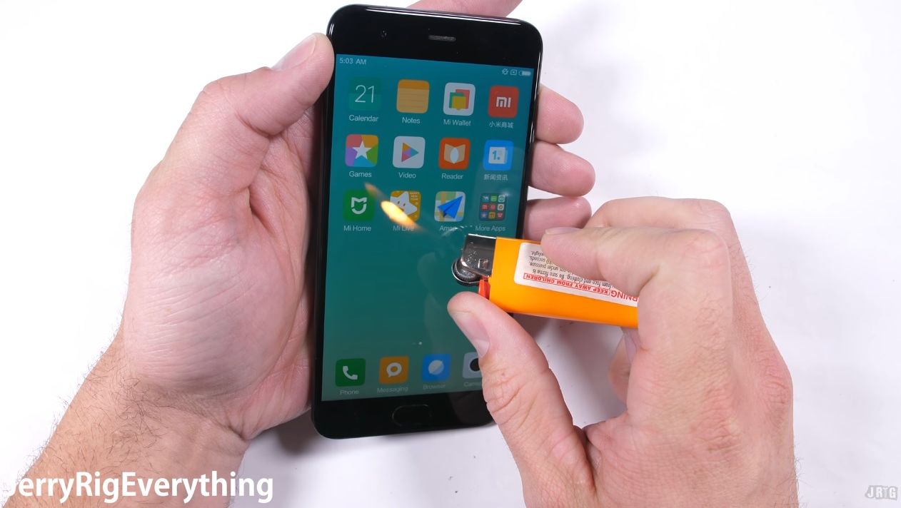 Acelaşi cutter poate totuşi să zgârie zona inferioară sau laterală, dar doar după insistențe. YouTuberul regretă şi lipsa jackului audio. Când vine momentul testului cu bricheta, pixelii mor după aproximativ 10 secunde, faţă de cele 4 secunde ale lui Mi 5. Totuşi testul final este cel de îndoire, trecut cu brio de handset. YouTuberul îndoaie cu toate puterea smartphone-ul, care nu plezneşte, nu se îndoaie excesiv şi nu are daună fatală. Şi asta nici îndoit din spate şi nici din faţă.