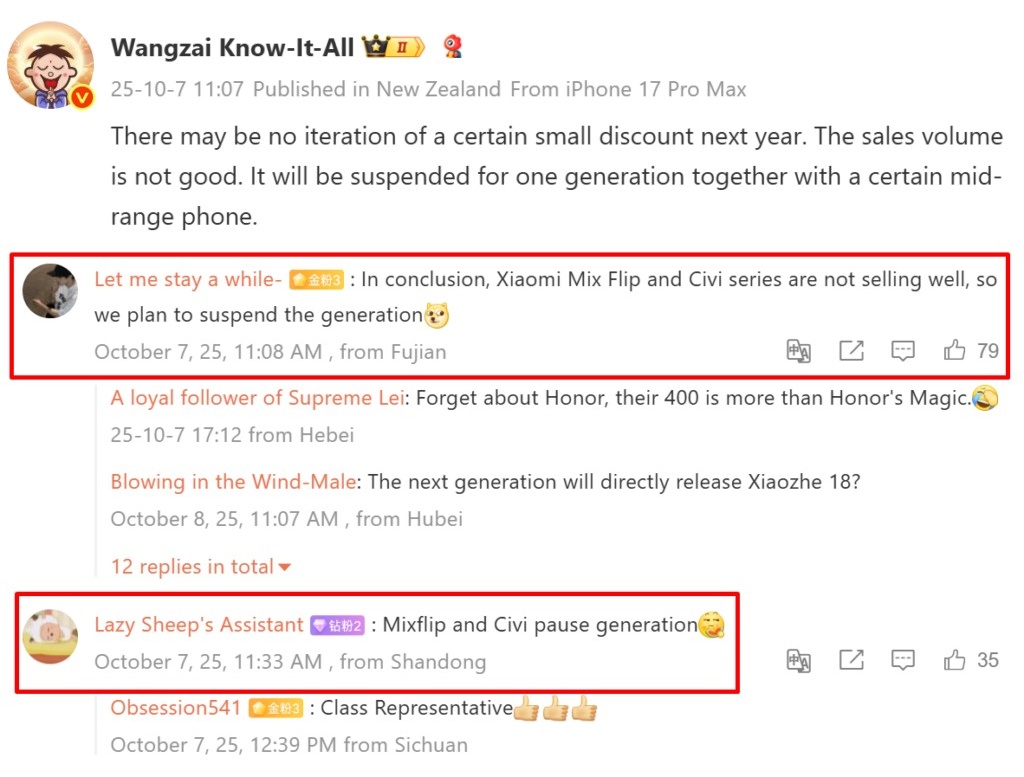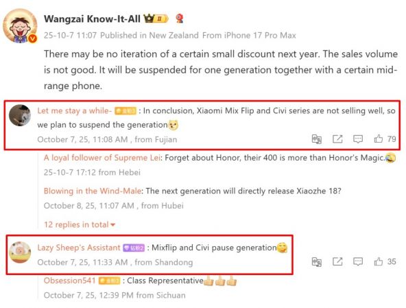Deși tipsterul nu a menționat explicit numele modelelor, discuțiile din comentarii indică destul de clar că este vorba despre Xiaomi. Atât Xiaomi MIX Flip 2, cât și Civi 5 Pro nu au reușit să impresioneze pe piața din China, aparent. Ciudat e că Xiaomi MIX Flip 3 a apărut deja în baza de date IMEI, ceea ce înseamnă că dezvoltarea sa era într-o fază destul de avansată. Zvonurile din online aduceau în discuție debutul acestui model până la finalul acestui an în China.