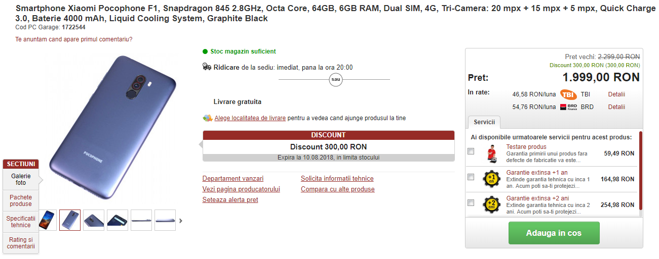 Dacă în urmă cu mai bine de o lună cei de la PC Garage ne ofereau detalii despre smartphone-ul Xiaomi Mi A2 înainte de lansarea sa oficială prin intermediul listării la vânzare, iată că și acum în august avem parte de o scăpare similară. Aceasta este asociată smartphone-ului Xiaomi Pocophone F1 care beneficiază de același tratament, fiind listat alături de preț, specificații și fotografii pe site-ul acestui retailer.